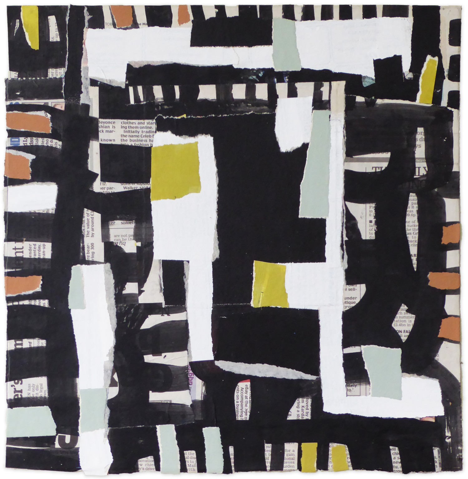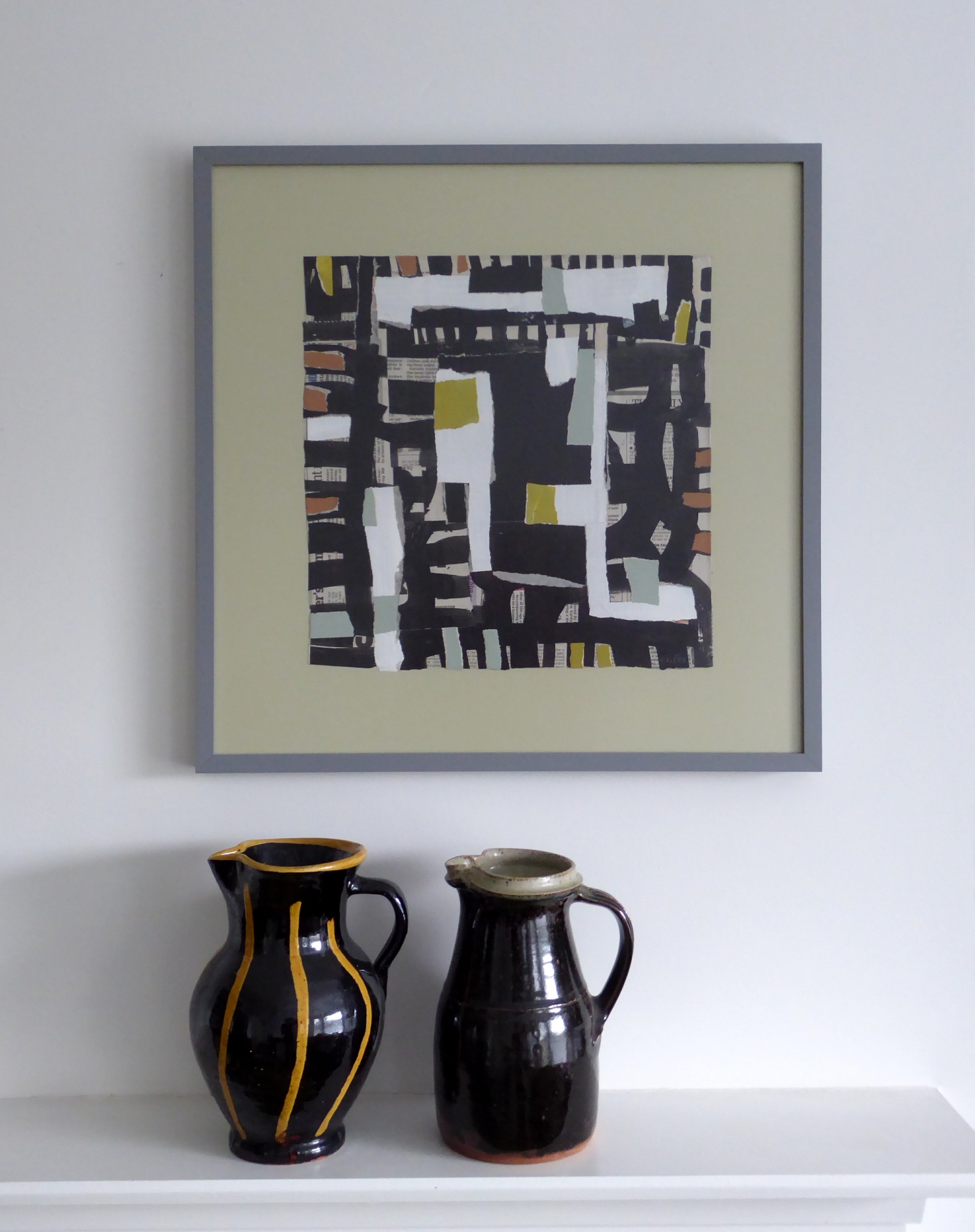 Collage framed in painted wooden frame with non-reflective perspex