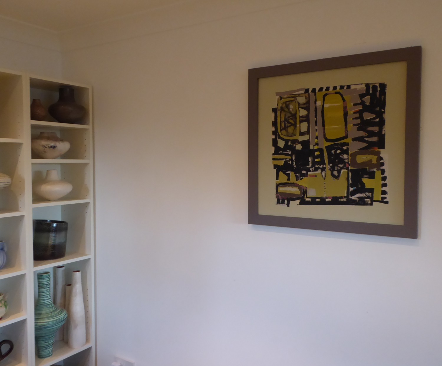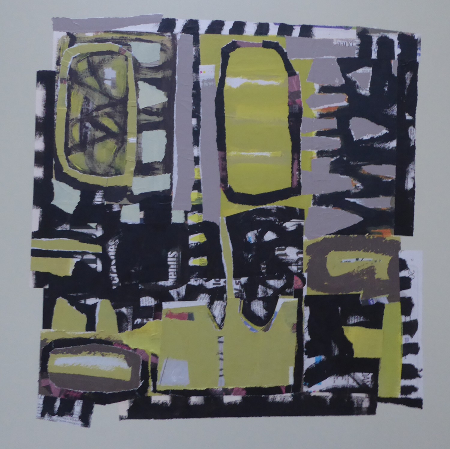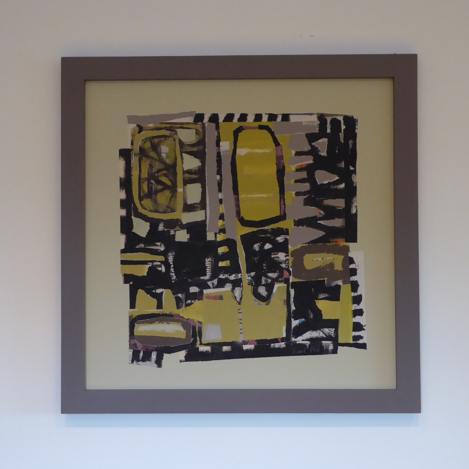 Collage framed in painted wooden frame No glass or perspex on surface