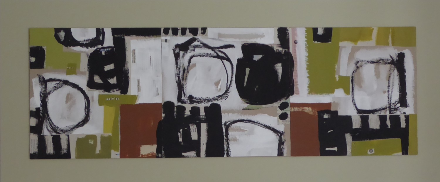 Collage in 3 parts mounted on thick painted board with hanging device on the back
