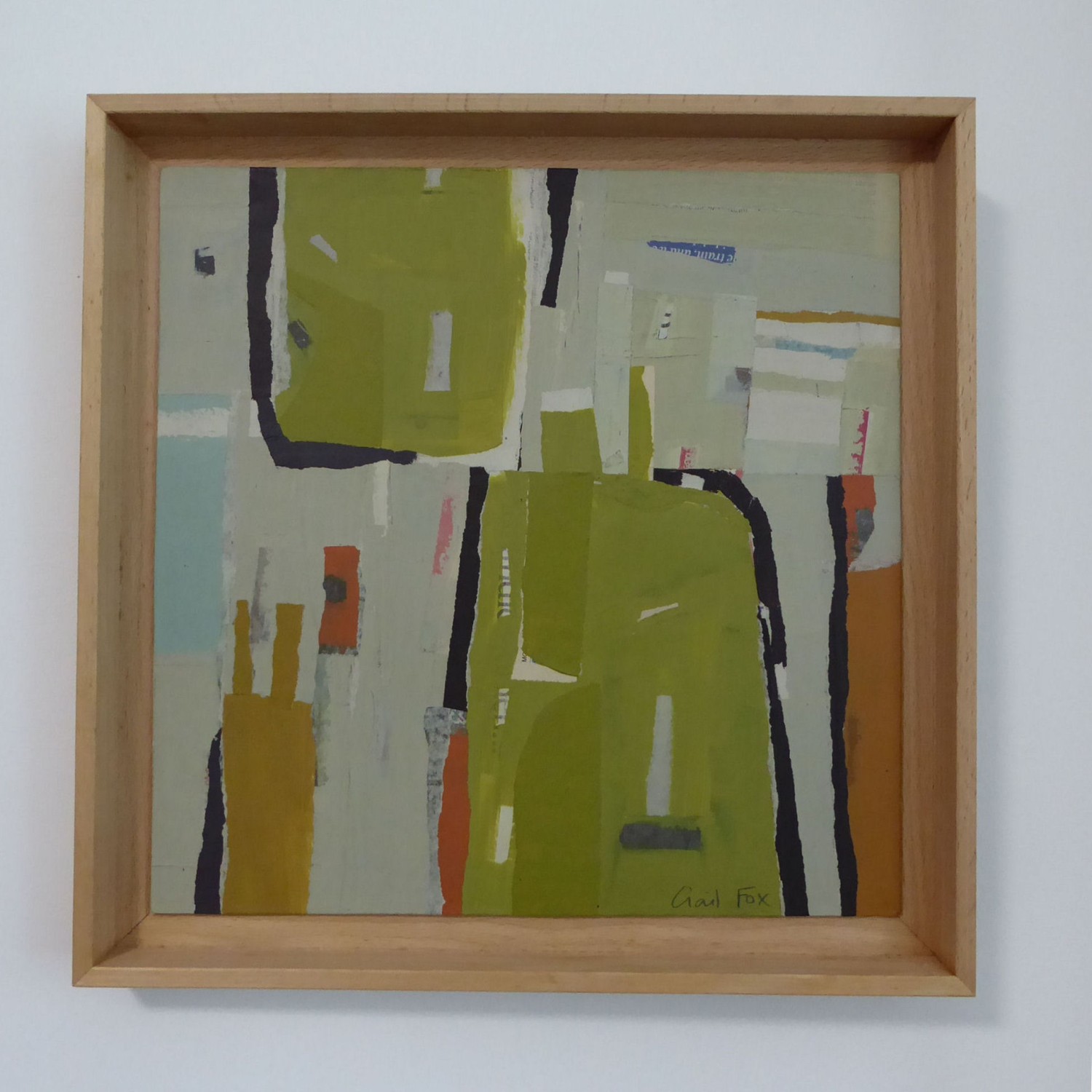 Collage on MDF board framed in solid beech Surface sealed with cold wax
