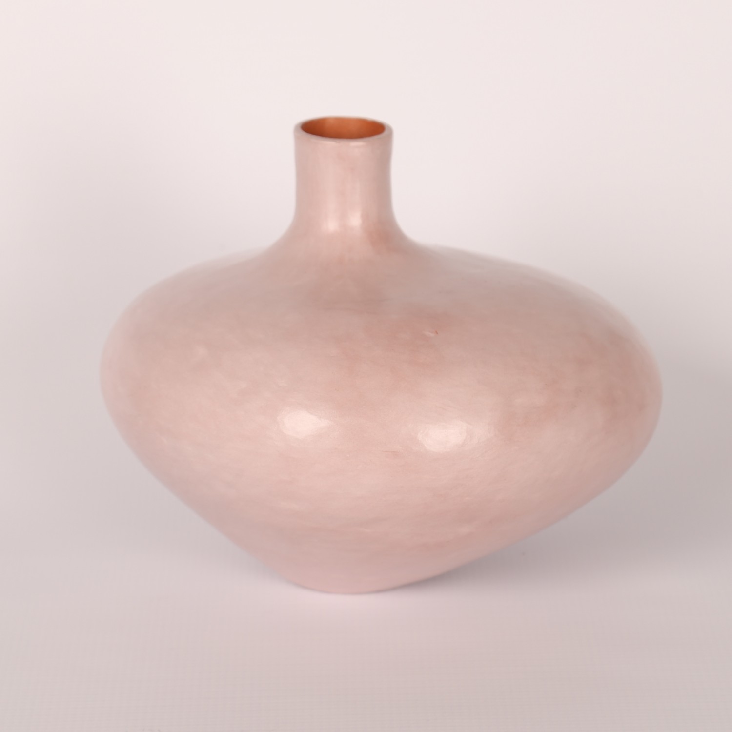 Hand-built coil pot in red earthenware clay, with pink slip surface, burnished and polished